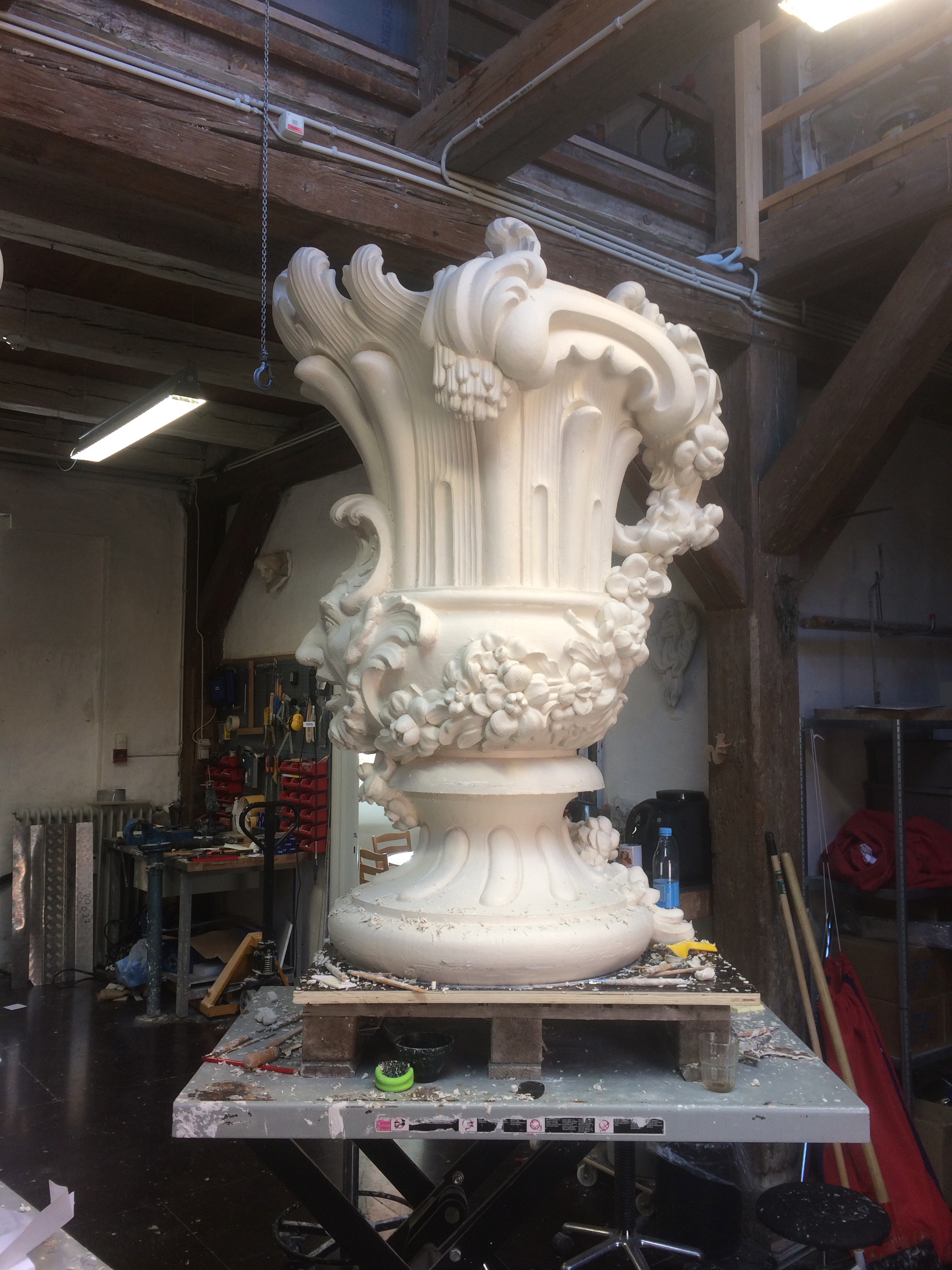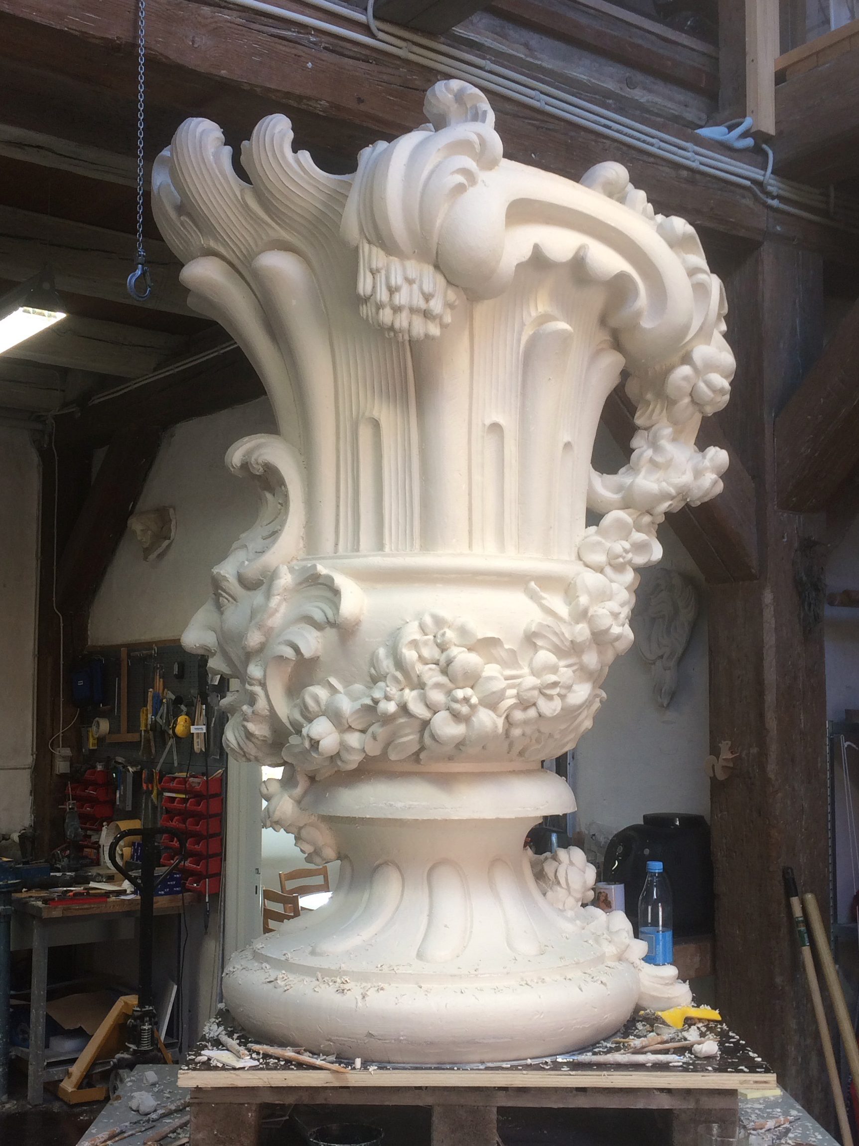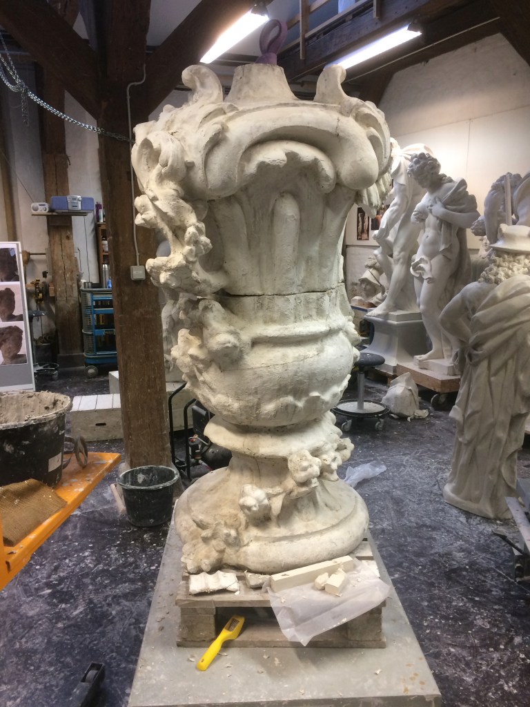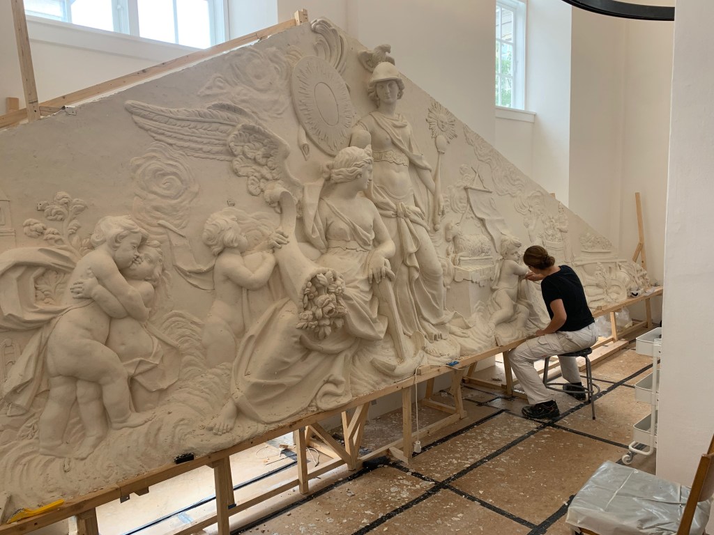 Opstramning og artikulering af hele overfladen efter kraftig erosion. Arbejdet er informeret af studier af andre rokokovaser og kartoucher på lapidariet i Christians IV Bryghus.