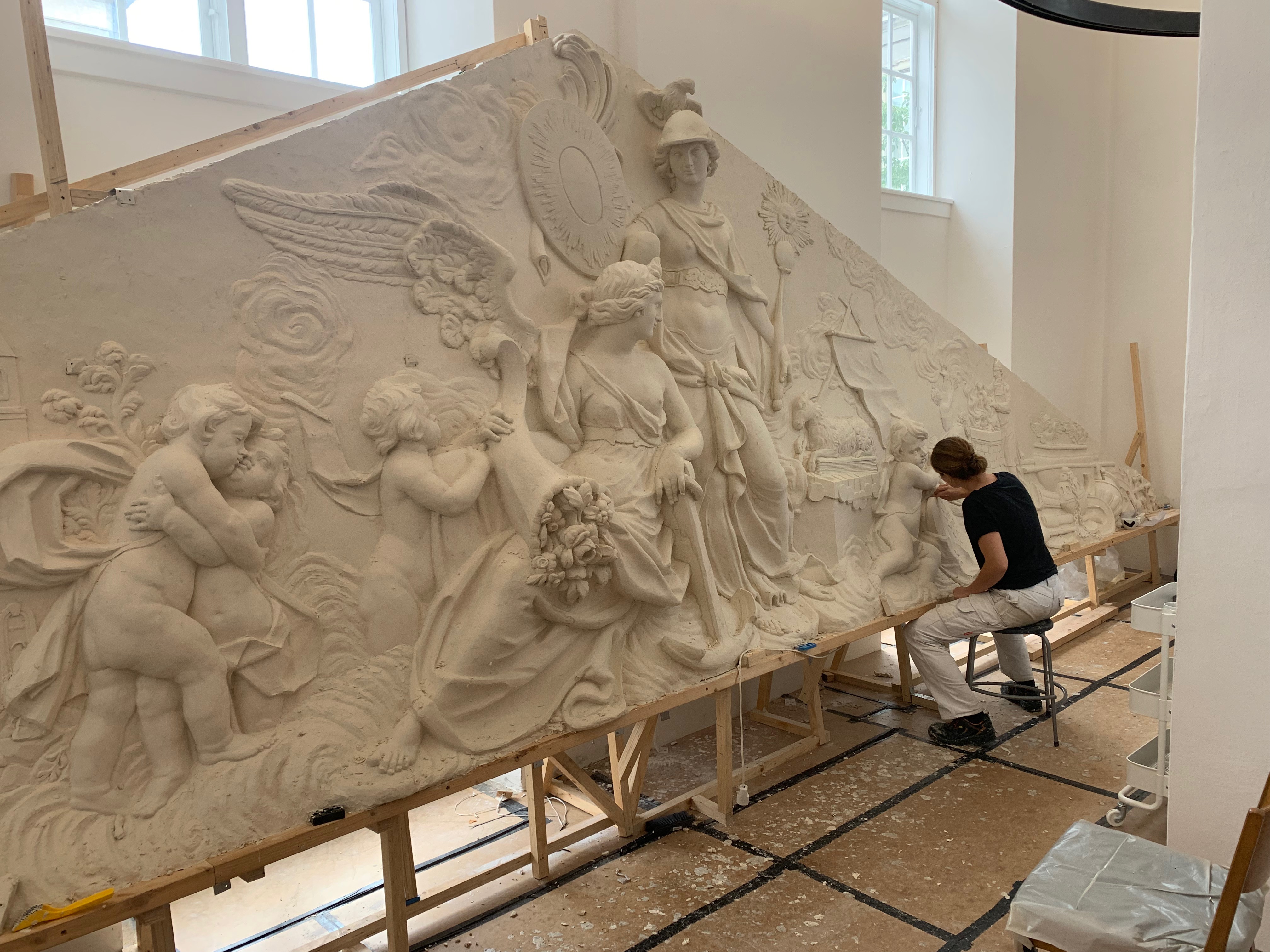 Restaureringen af frontispicerne af Johann Christoph Petzold på Nicolai Eigtveds bygning fra 1757. Relieffet bevæger sig fra basrelief i baggrunden og næsten op til rund-skulptur i hovedmotivet. Opstramning og artikulering af hele overfladen efter kraftig erosion. Stilistisk har vi arbejdet med den sene rokokostil med særlig opmærksomhed på Petzold ́s tydelige grafiske forvaltning af flader og planskift.